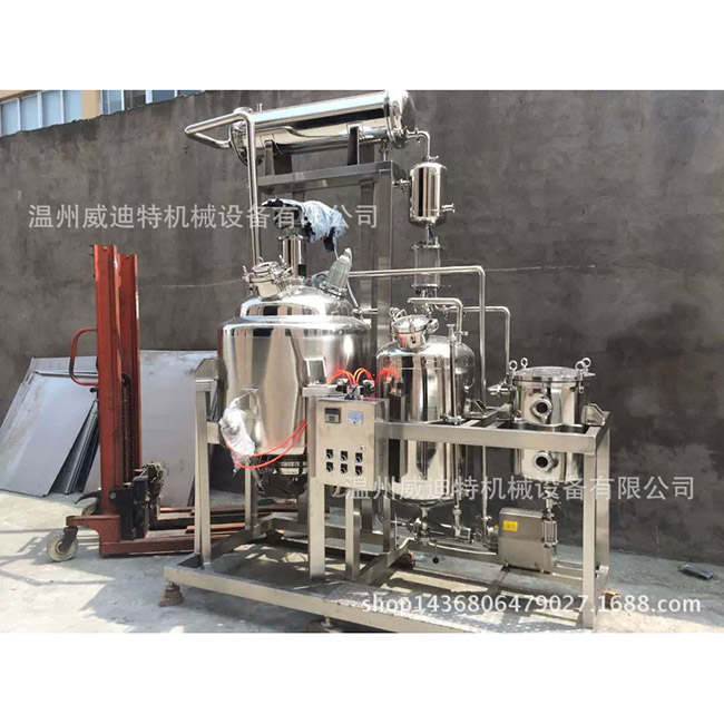 植物提取罐将准备好的处方药放入提取罐,在一定时间内一次浸泡5-10倍(根据溶剂性质和工艺要求而定的药品量),然后打开蒸汽阀加热并常用的夹套加热,在沸腾并提取一定时间后(仅在用水提取芳香油时才进行直接蒸汽加热),从提取槽底部提取的热提取物可以通过过滤器屏幕连续过滤到过滤器。输入集中器。在浓缩过程中产生的蒸汽进入冷凝器,成为冷凝液,并作为新的溶剂喷入萃取罐。