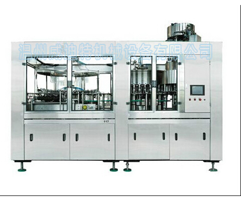 纯净水灌装生产线的工作过程:将瓶子通过风道传送,然后通过星型瓶传送到三合一清洗机中。洗瓶机的旋转板配有瓶夹,该瓶夹夹住瓶口,并沿导轨旋转180°以使瓶口朝下。在洗瓶机的特定区域中,洗瓶机夹的喷嘴喷洒洗瓶水以冲洗瓶内壁。冲洗并沥干瓶子后,用瓶子夹夹住瓶子,并将其沿瓶子的口朝上沿着导轨旋转180°。清洗后的瓶子通过洗瓶星轮从洗瓶机中输出,并转移到灌装机中。进入灌装机的瓶子被瓶颈塞住,凸轮抬起瓶子,并且装料阀在瓶子的开口处打开。填充方法使用重力填充方法。填充阀打开后,物料通过填充阀完成填充过程。灌装完成后,瓶子的嘴巴下降,离开灌装阀,瓶子通过瓶颈过渡刻度盘进入旋盖机。旋盖机的防旋转刀会堵塞瓶颈,并使瓶子保持直立以防止其旋转。压盖头在压盖机上不断旋转,凸轮的作用实现了压盖,压盖,压盖,压盖操作,并完成了整个压盖过程。成品瓶子通过出瓶拨盘轮从封盖机传送到瓶子传送链,三合一机器由传送链传送。